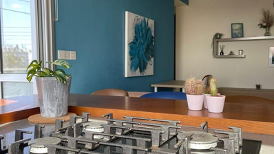 • Gourmet Kitchen: A sleek, peninsula-style kitchen equipped with a premium gas stovetop, ample storage, and chic pendant lighting—perfect for hosting.